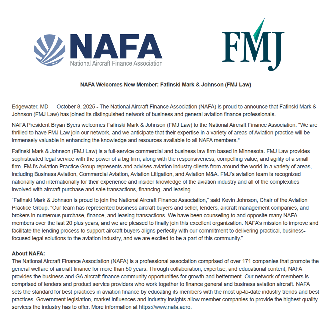 Fafinski Mark & Johnson, P.A. is proud to join the National Aircraft Finance Association! NAFA sets the standard for best practices in aviation finance, and NAFA’s network of members is comprised of lenders and product service providers who work together to finance general and business aviation aircraft.
