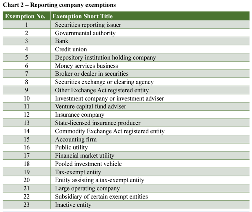 Here is a chart outlining the 23 exemptions (click to enlarge). This chart is taken from FinCEN’s Small Entity Compliance Guide at Chapter 1.2 (see page 4).